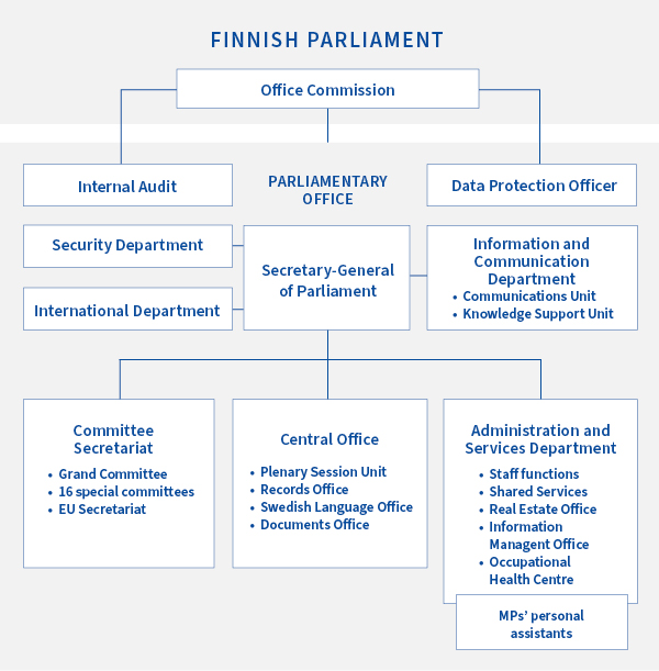 The Parliamentary Office's six departments and units work under the Secretary-General focusing on the fields of legislative work, committee work, international affairs, communications, information and library services, administration (e.g. personnel, financial, real estate and information management services) as well as the security of Parliament. The Parliamentary Office is also responsible and in charge of the system of providing personal assistants to MPs.