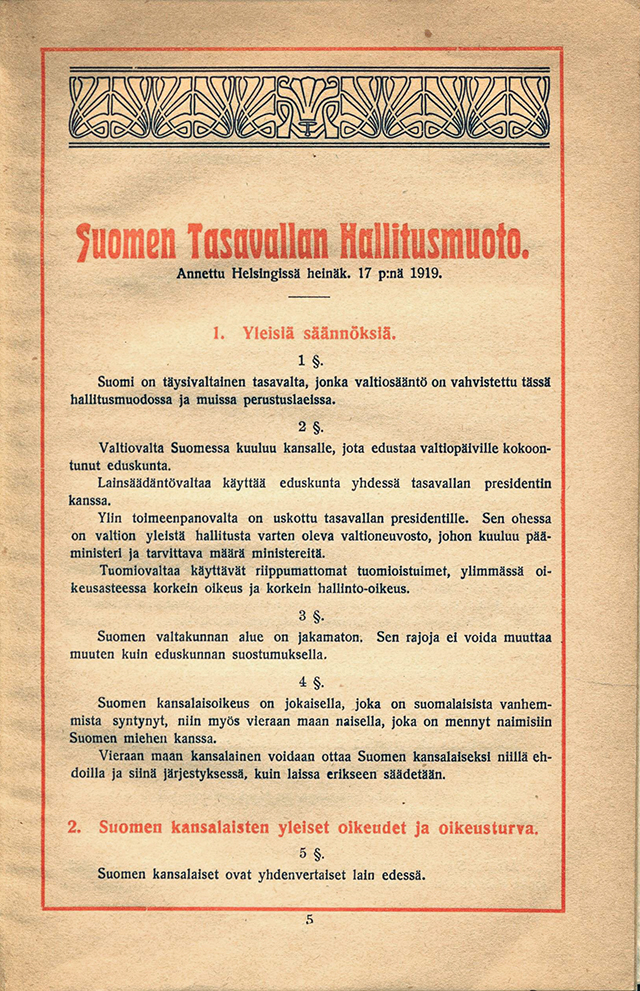 Hallituksen esitys Suomen hallitusmuodoksi (ASK 1919 1, HE 17) tuotiin eduskuntaan toukokuun puolivälissä. Ennen lähettämistä perustuslakivaliokuntaan käytiin lyhyt keskustelu (PTK 1919 1, 14.5.), jossa paljastui, että monarkiaa kannattava vähemmistö tulisi vastustamaan tasavaltaista esitystä. Tasavaltalaisiin lukeutunut maalaisliiton edustaja Juutilainen oli sitä mieltä, että tavallinen kansa ei osaisi kakistelematta lausua presidentti-sanaa. Hän ehdotti tilalle ”esimiestä” tai ”valtakunnan esimiestä”.