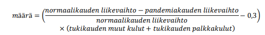 Tuki-intensiteetti lasketaan seuraavasti: [(yrityksen liikevaihto 1 päivän maaliskuuta ja 31 päivän toukokuuta 2019, nämä päivät mukaan lukien — yrityksen liikevaihto 1 päivänä maaliskuuta ja 31 päivänä toukokuuta 2021, nämä päivät mukaan lukien): yrityksen liikevaihto 1 päivänä maaliskuuta ja 31 päivänä toukokuuta 2019, nämä päivät mukaan lukien] – 0,3. Tukien intensiteetin enimmäismäärä on 70 prosenttia, tuen määrä enintään 1 000 000 euroa. Tuesta vähennetään tukikaudelle kohdistuvat vakuutuskorvaukset ja muut samoihin kustannuksiin saadut valtiontuet. Tukea myönnettäessä otetaan huomioon, ettei Euroopan komission päätöksen SA.63205 mukainen tukien konsernikohtainen enimmäismäärä, 10 000 000 euroa, ylity.
