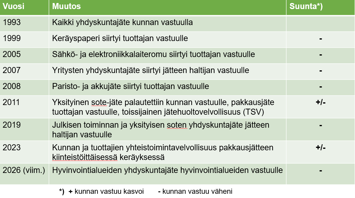 Kuva 1. Yhdyskuntajätehuollon vastuunjakoa koskevat muutokset vuodesta 1999 alkaen.
