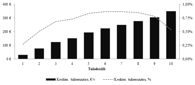 Koska perusvähennys myönnetään muiden tulosta tehtävien vähennysten tekemisen jälkeen, vähennys kohdistuu päivärahatulon-, palkkatulon- ja eläketulonsaajalla eri tulotasoille mainituista tuloista tehtävien erilaisten vähennysten vuoksi. Perusvähennys tulee täysimääräisenä myönnettäväksi päivärahatuloa saavalla 3 020 euron vuosituloilla, palkkatuloa saavalla noin 5 800 euron vuosituloilla ja eläketuloa saavalla noin 11 200 euron vuosituloilla. Perusvähennyksen vaikutus ulottuu päivärahatulonsaajalla noin 19 700 euron vuosituloille, palkkatulonsaajalla noin 25 400 euron vuosituloille ja eläketulonsaajalla noin 21 900 euron vuosituloille asti.