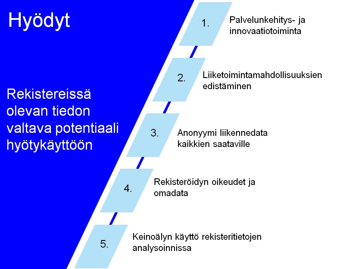 Toisessa vaiheessa parannetaan edellytyksiä liikenteen palveluiden digitalisoimiseksi ja tiedon hyödyntämiseksi. Tämä toteutetaan yhtenäistämällä sekä tarpeellisilta osin luomalla uutta sääntelyä liikennepalveluja koskevasta tiedon käytöstä ja luovuttamisesta sekä liikenteen rekistereistä.