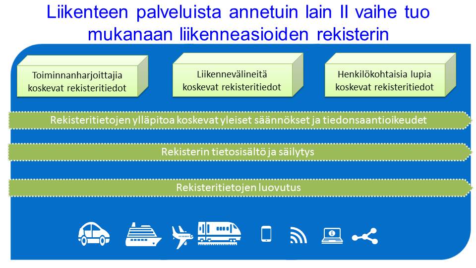 Liikenteen rekistereiden kokonaisuudistuksen avulla mahdollistettaisiin rekistereissä olevan suuren tietopääoman hyödyntäminen uudella tavalla. Liikenteen rekisterisääntelyn uudistuksella vahvistetaan rekisteröityjen itsensä mahdollisuuksia käyttää omaa tietoaan ja hyötyä paremmista liikkumispalveluista. Lisäksi yritysten mahdollisuuksia tehdä tutkimusta sekä kehittää ja tarjota liikkumispalveluita lisättäisiin, samoin kuin parannettaisiin Liikenteen turvallisuusviraston viranomais- ja palvelutoimintaa. Keskeistä uudistuksessa olisi rekisteritietojen luovutuskäytäntöjen uudistaminen digitalisaation mahdollistamalla ja vaatimalla tavalla. Liikenteen palveluista annettuun lakiin siirrettäisiin ajoneuvoliikennerekisteristä annetun lain ja ajoneuvojen rekisteröintitoiminnasta annetun lain sääntely kokonaisuudessaan. Lisäksi rautatiejärjestelmän liikenneturvallisuustehtävistä annetun lain, ajoneuvolain, rautatielain, vesikulkuneuvorekisteristä annetun lain, laivaväestä ja aluksen turvallisuusjohtamisesta annetun lain, laivaväen luetteloinnista annetun lain, alusrekisterilain sekä ilmailulain rekisterinpitoa koskevat säännökset siirrettäisiin liikenteen palvelulaista annettuun lakiin. Ehdotetussa liikenneasioiden rekisterissä olisi tiedot toiminnanharjoittajaluvista, liikennevälineistä sekä liikenteen henkilöluvista. Ehdotus sisältäisi säännökset rekisteriin tallennettavista tiedoista, niiden säilytysajoista ja luovuttamisesta. Sillä mukautettaisiin henkilötietojen osalta EU:n yleisen tietosuoja-asetuksen säännöksiä kansallisesti asetuksen sallimalla tavalla.