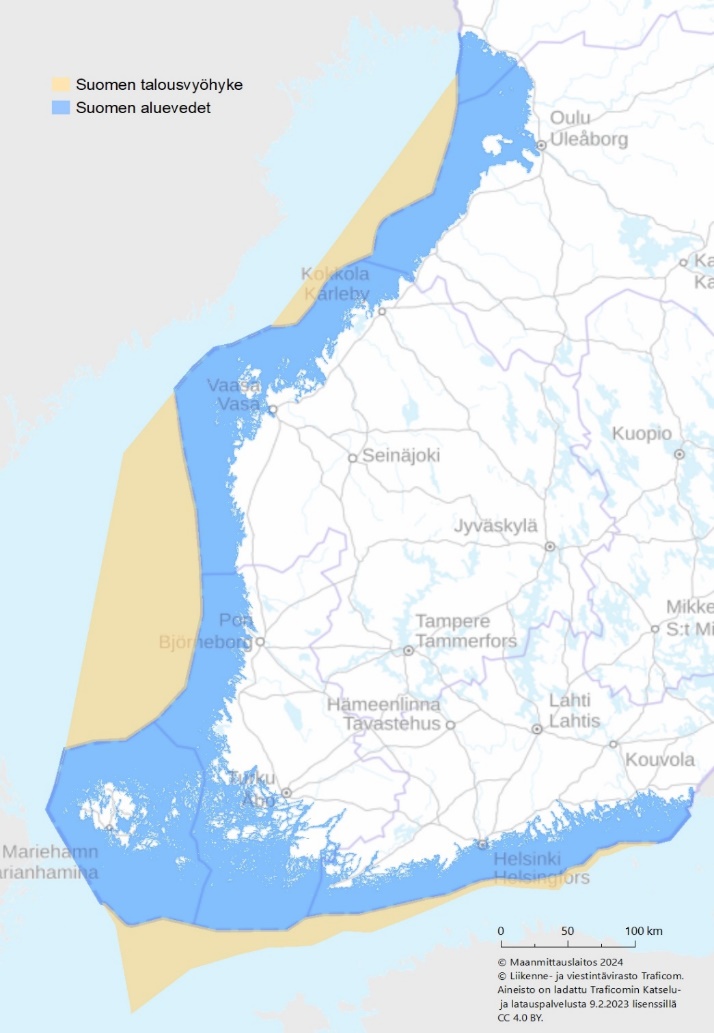 Talousvyöhykelain 1 §:n mukaan Suomen talousvyöhyke käsittää Suomen aluevesiin välittömästi liittyvän merialueen, jonka ulkoraja määräytyy Suomen vieraiden valtioiden kanssa tekemien sopimusten mukaisesti ja jonka ulkorajan sijainti osoitetaan valtioneuvoston asetuksella. Aluevedet käsittävät Suomen rannikkoa lähimpänä olevat merialueet, ja ulommilla merialueilla aluevesien ulkopuolella Pohjanlahdella ja Suomenlahdella on Suomen talousvyöhyke. Ahvenanmaan itsehallintolain (1144/1991) 2 §:n mukaan Ahvenanmaan maakuntaan kuuluvat aluevedet, jotka voimassa olevien Suomen aluevesien rajoja koskevien säännösten mukaan välittömästi liittyvät maakunnalle kuuluvaan alueeseen. Ahvenanmaan maakuntalainsäädäntöä ei sovelleta talousvyöhykkeellä.