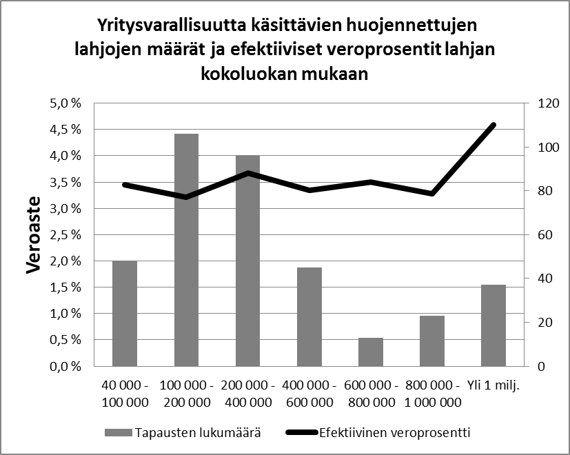 Huojennuksen tuoma etu on varsin mittava. Maatilavarallisuuden luovutuksissa efektiivinen saajakohtainen veroprosentti (maksettavan veron suhde varojen käypään arvoon) oli keskimäärin 1,6 (aritmeettinen keskiarvo) ja muun yritysvarallisuuden luovutuksissa keskimäärin 3,5 prosenttia.