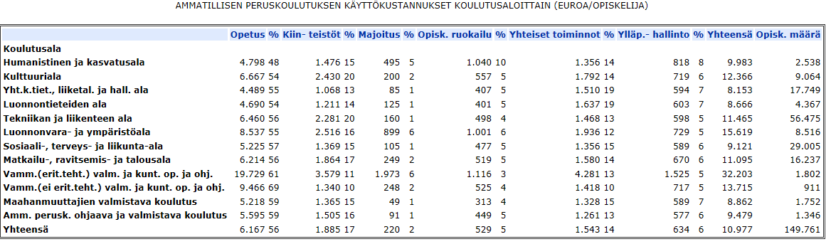 Seuraavassa olevassa taulukossa ovat ammatillisen peruskoulutuksen opetuksen kustannukset vuonna 2014.