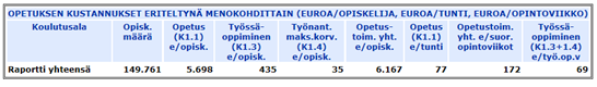 Yksikköhintoja laskettaessa ei oteta huomioon oppisopimuskoulutuksesta aiheutuneita kustannuksia, eikä kyseistä koulutusta saavia opiskelijoita.