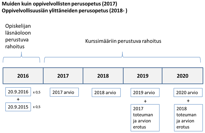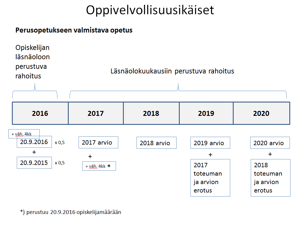 Perusopetukseen valmistavan opetuksen rahoitus määräytyy varainhoitovuoden ja sitä edeltävän vuoden laskentapäivän 20.9. opiskelijamäärien keskiarvon perusteella. Rahoitus on kokonaan valtion rahoitusta. Vuoden 2016 voimassa olevan 12 §:n 2 momentin mukaan niiden perusopetukseen valmistavan opetuksen oppilaiden osalta, jotka ovat laskentapäivään 20.9.2016 mennessä olleet yhtäjaksoisesti opetuksessa vähintään neljä, mutta vähemmän kuin kahdeksan kuukautta, rahoituksen euromäärä kerrotaan luvulla 0,5. Laskentapäivänä 20.9.2016 ilmoitetut oppilaat vaikuttavat myös vuonna 2017 myönnettävään rahoitukseen.