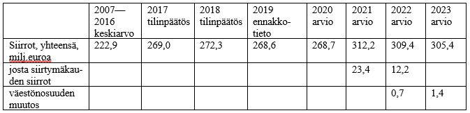 Taulukossa alla on esitetty yhteenveto ja arvio vuosittain Ahvenanmaan maakunnalle suoritettavista siirroista.