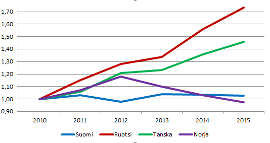 Finanssivalvonnan kustannusten ja valvonta- ja toimenpidemaksujen kehitystä vuosina 2009—2015 on kuvattu alla taulukossa 1 ja kuvioissa 1 ja 2. Vuoden 2008 valvontamaksulaki laadittiin siten, että lain enimmäismäärä kerättiin täysimääräisenä, jotta Finanssivalvonnan kustannukset kyettiin kattamaan sen ensimmäisenä kokonaisena toimintavuotena. Tämän jälkeen rahoitussektoriin kuuluvien valvottavien taseiden kasvu on johtanut siihen, että lain mahdollistama maksujen enimmäismäärä on kasvanut kymmenellä miljoonalla noin 34 miljoonaan euroon. Sen sijaan Finanssivalvonnan kokonaiskustannusten ja tosiasiassa kerättyjen valvontamaksujen kehitys on ollut hyvin maltillista. Myös Pohjoismainen vertailu osoittaa, että Finanssivalvonnan kustannuskehitys on ollut maltillista erityisesti suhteessa Ruotsiin ja Tanskaan.