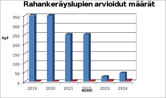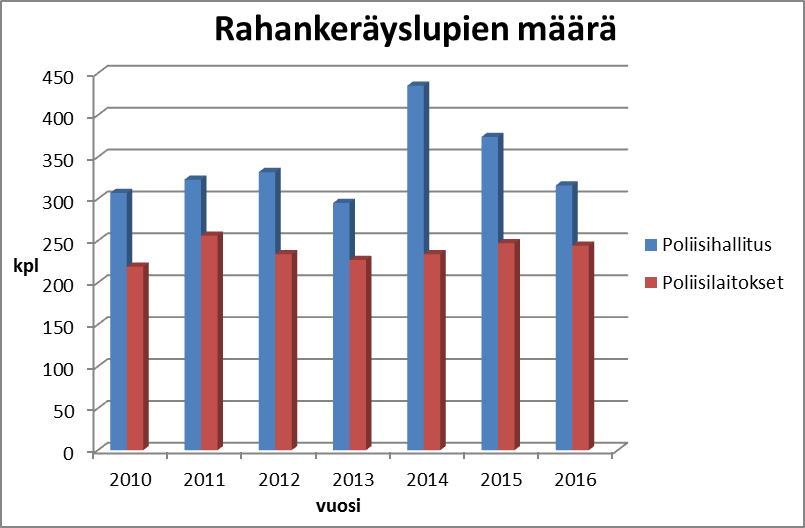 Myönnettyjen rahankeräyslupien määrä on kasvanut vähitellen viimeisten vuosien aikana. Poliisihallitus on myöntänyt lupia vuosittain keskimäärin noin 340 ja poliisilaitokset noin 240.