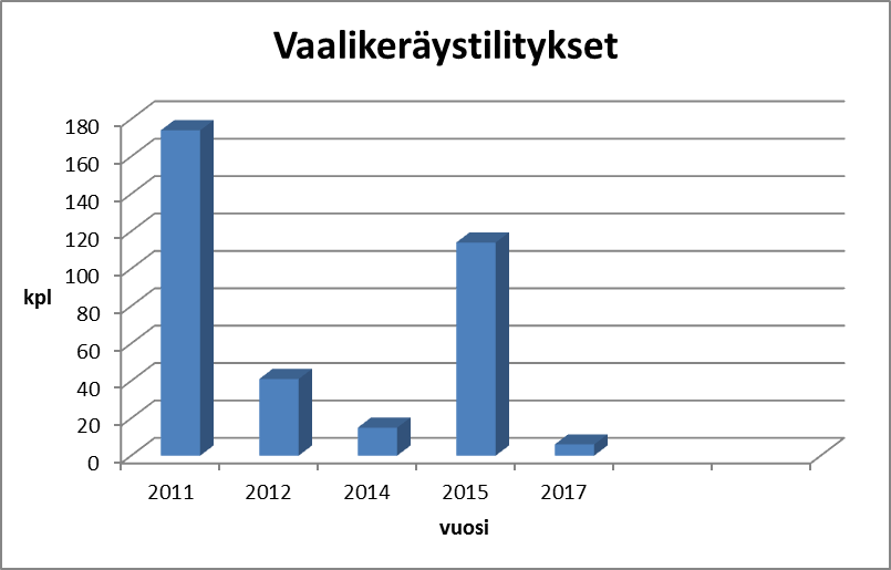 Yksinomaan yleisissä vaaleissa ehdokkaana olevan tukemiseksi toimivan yhdistyksen tai puoluelain (10/1969) 8 §:n 1 momentissa tarkoitetun puolueyhdistyksen kampanja-aikana järjestämään rahankeräykseen, joka järjestetään vaalikampanjan kulujen kattamiseksi, ei myöskään tarvita rahankeräyslupaa. Rahankeräyslain tarkoittamista vaalikeräyksistä tulee kuitenkin tehdä rahankeräystilitys. Poliisihallitukselle tehtyjen tilitysten määrä on vaihdellut eri aikoina. Vaalikeräystilityksiä on tehty Poliisihallitukselle vuosina 2010–2015 yhteensä 344. Vuonna 2010, 2013 ja 2016 ei järjestetty lainkaan yleisiä vaaleja. Vuosina 2011 ja 2015 järjestettiin eduskuntavaalit ja vuosina 2012 ja 2017 järjestettiin kuntavaalit ja vuonna 2014 europarlamenttivaalit. Presidentinvaalit järjestettiin vuonna 2012. Poliisihallituksen marraskuussa 2017 antaman tiedotteen mukaan vuoden 2017 kuntavaalien rahankeräystilityksiä oli saapunut määräaikaan mennessä kuusi kappaletta. Ehdokkaita vuoden 2017 kuntavaaleissa oli asetettu 33 618. Tilastotietoa siitä, kuinka monen ehdokkaan tukemiseksi järjestettiin vaalikeräys, ei ole saatavilla.