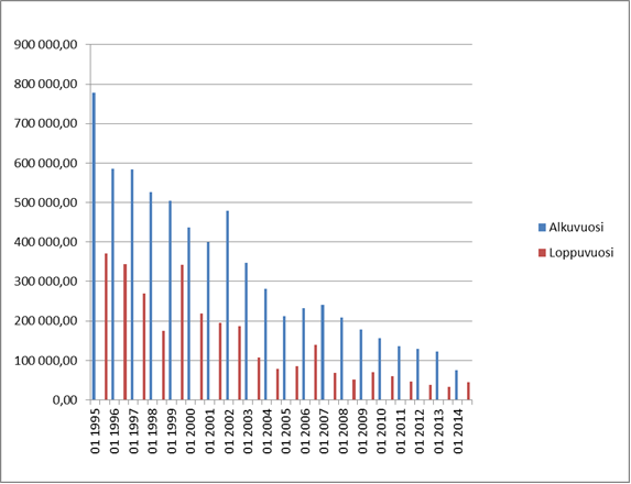 Kasvinjalostusmaksujen kertymät vuodesta 1995 eteenpäin (euroina)