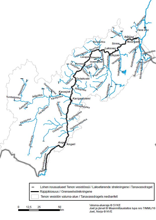 1 §.Soveltamisalue. Pykälässä määrätään, että kalastussääntö on voimassa sillä osalla Tenojokea, Inarinjokea ja Skietshamjokea, joka muodostaa Suomen ja Norjan välisen valtakunnan rajan. Norja antanee kansallisen kalastussäännön omalle rajajokiosuudelleen. Norjalle kuuluvalla Tenon alaosalla kalastussäännön kalastusta koskevat määräykset eivät voi olla lievempiä kuin rajajokiosuudella kulloinkin voimassa olevat määräykset. Tenon sivujokia koskevat kalastussäännöt määritellään kansallisesti ja ne voivat vaihdella sivuvesien lohikantojen tilanteen mukaisesti.