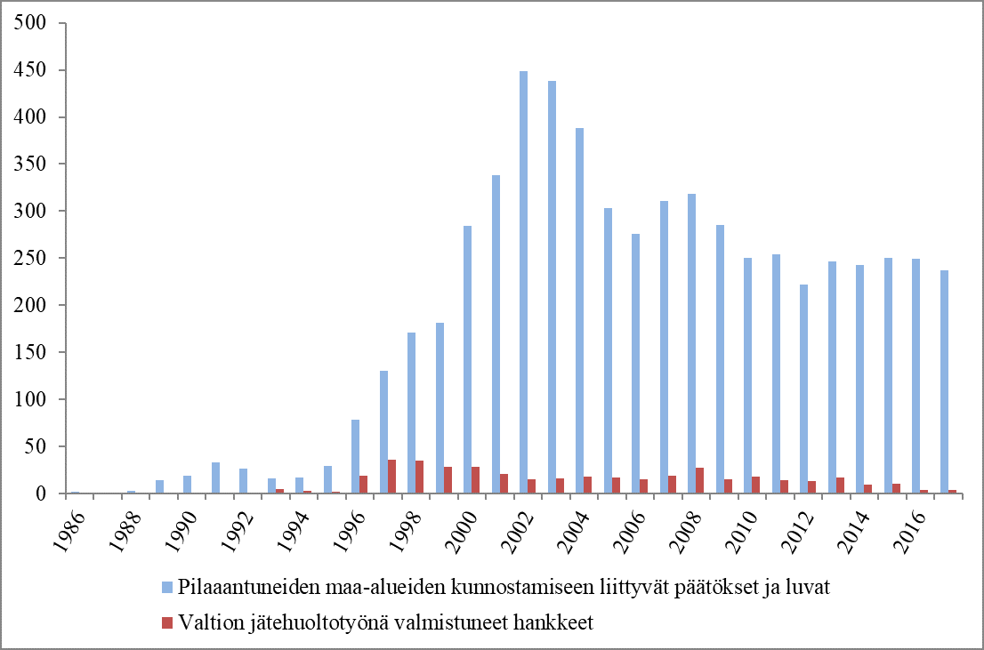 Kuva 1. Pilaantuneiden maa-alueiden kunnostamiseen liittyvät viranomaispäätökset ja valtion jätehuoltotyönä valmistuneet hankkeet vuosittain. Lähde: SYKE 2018.