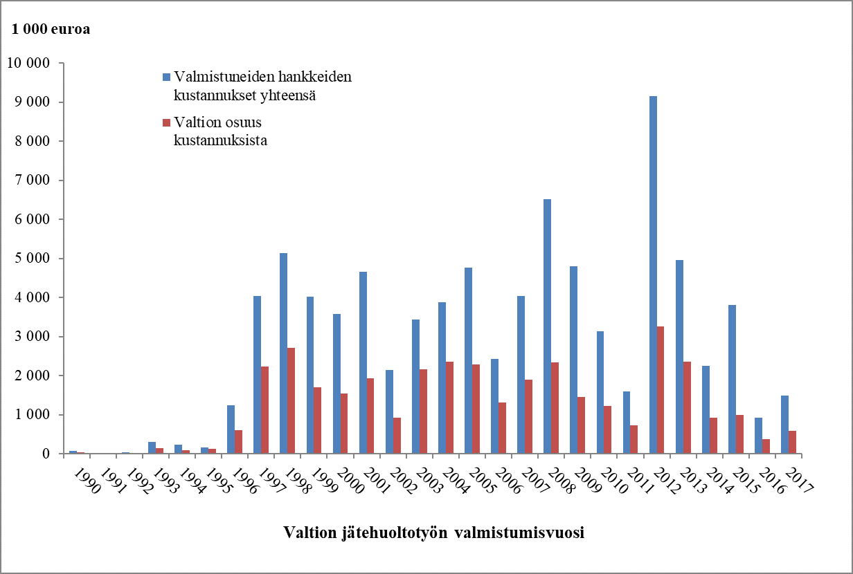 Kuva 2. Valtion jätehuoltotöinä valmistuneiden hankkeiden kokonaiskustannukset ja valtion osuus kustannuksista vuosina 1990—2017. Lähde: SYKE 2018.