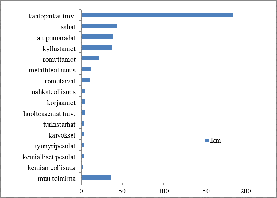 Kuvan 3 toimialajakaumasta käy esille, millaisia kohteita on valtion jätehuoltotyöjärjestelmän piirissä. Tähän saakka puhdistetuista kohteista lähes puolet on ollut vanhoja, kauan sitten toimintansa lopettaneita kaatopaikkoja. Toiminnan aikana niille on viety yhdyskuntajätteitä, vaarallisia jätteitä ja teollisuuden erityisjätteitä ilman erityistä valvontaa tai dokumentointia. Aikaisemmin oli myös yleistä, että kaatopaikat syntyivät entisille maa-ainesten ottoalueille ja siten myös vedenhankinnan kannalta tärkeille pohjavesialueille. Vielä 1980-luvulla kaatopaikkatoiminnan loppumiseen liittyvät jälkitoimet ja seurannat ovat olleet vähäisiä.