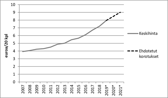 Viime vuosina toteutetuilla veronkorotuksilla on tavoiteltu tupakkatuotteiden maltillista ja asteittaista hinnannousua. Veronkorotusten yhteenlaskettu vaikutus hintoihin on kuitenkin ollut suuri. Vuoden 2019 veronkorotusten vaikutukset eivät ole vielä kaikilta osin toteutuneet, sillä ennen veronkorotusten voimaantuloa verovelvolliset luovuttavat tyypillisesti kulutukseen suuria määriä tupakkatuotteita, minkä vuoksi veronkorotusten vaikutukset tuotteiden hintoihin toteutuvat noin puoli vuotta veronkorotusten voimaantulon jälkeen. Arvioiden mukaan savukkeiden keskihinta on kaksinkertaistunut vuodesta 2008, kun viimeisinkin vuoden 2019 veronkorotus on toteutunut. Keskihinta on tällöin kasvanut hieman yli neljästä eurosta noin kahdeksaan euroon 20 kappaleelta. Verorasituksen arvioidaan tällöin kasvaneen noin 2,3-kertaiseksi vuoteen 2008 verrattuna. Keskihintaisesta savukeaskista kannetun tupakkaveron määrä oli noin 2,30 euroa 20 kappaleelta vuonna 2008, kun vuoden 2019 veronkorotusten toteuduttua sen arvioidaan olevan 5,50 euroa 20 kappaleelta.