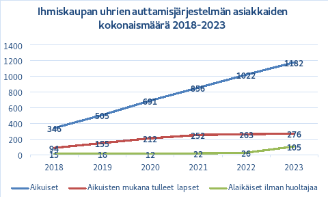 Mahdollisia tai tunnistettuja ihmiskaupan uhreja oli 1 287 vuonna 2023. Asiakkaista 105 otettiin avun piiriin alaikäisenä. Auttamisjärjestelmästä saavat apua ihmiskaupan uhrien lisäksi myös heidän alaikäiset lapsensa, joita oli asiakkaana yhteensä 276. Asiakkaista 224 oli kansainvälisen suojelun hakijoita, jotka saavat palvelunsa siitä vastaanottokeskuksesta, jonka kirjoilla he ovat. Lisäksi asiakkaana oli 92 henkilöä, jolla ei ole rekisteröityä kotikuntaa Suomessa, eivätkä he ole kansainvälistä suojelua hakevia tai tilapäistä suojelua saavia henkilöitä. Auttamisjärjestelmä järjestää näiden henkilöiden tarvitsemat palvelut.