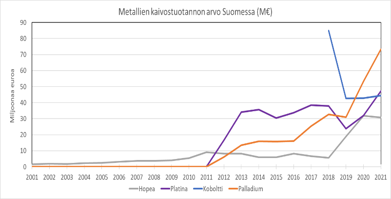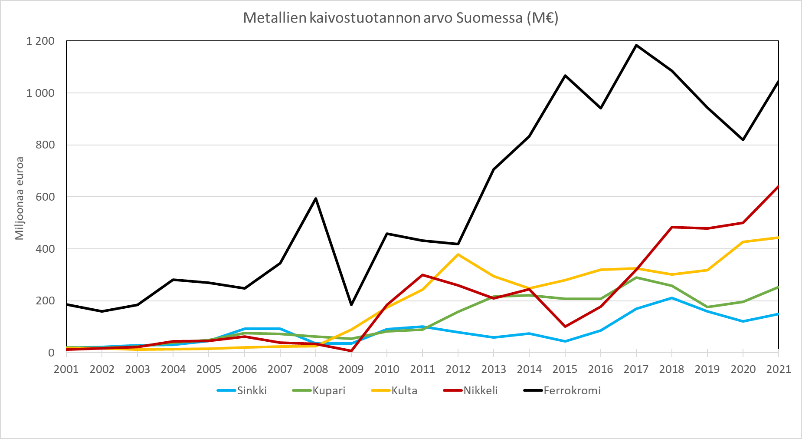 Metallimalmien vuoden 2021 tuotannon arvosta nikkelin osuus oli suurin, noin 32 prosenttia heinäkuun 2022 mukaisella hintatasolla. Kromituotannon arvon vertailukelpoisuutta hankaloittaa maailmanmarkkinahintatietojen puute, mutta kromituotannon osuus oli noin 28 prosenttia, jos hintana käytetään Yhdysvaltain geologisen instituutin hinta-arviota ferrokromin kromisisällölle vuodelle 2021. Kullan tuotannon arvo oli noin 18 prosenttia, kuparin noin 8 prosenttia ja sinkin noin 6 prosenttia heinäkuun 2022 maailmanmarkkinahintatietojen mukaan. Metallituotannon arvoa on kokonaisuudessaan nostanut vuonna 2021 ja erityisesti vuonna 2022 metallien maailmanmarkkinahintojen nousu.