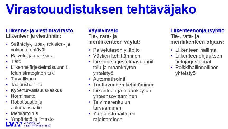 Liikenteenohjausyhtiöön (Traffic Management Finland Oy) siirrettäisiin ELY-keskuksista tieliikennetelematiikan ja asiakaspalvelukeskuksen tehtävät 1 päivänä tammikuuta 2021.
