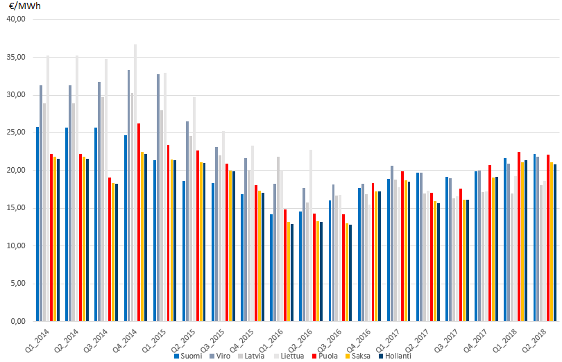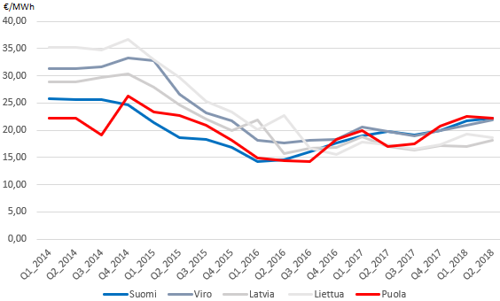 Kuva 2. Maakaasun verottoman tukkuhinnan kehitys Suomessa, Baltian maissa ja Puolassa 2014-2018. Lähteet: Energiaviraston maakaasun hintatilasto ja Euroopan komission neljännesvuosittain julkaistavat markkina-analyysiraportit.