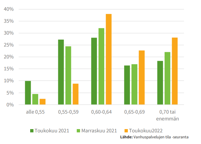 THL:n Vanhuspalvelujen tila -seurannan perusteella toukokuussa 2022 ympärivuorokautisen hoidon yksiköt ovat varsin hyvin saavuttaneet nykyisen 0,6 työntekijän mitoitusvaatimuksen ja usea mitoituksen alittavakin yksikkö on hyvin lähellä 0,6 työntekijän mitoitusta. Toukokuussa 2022 oli 203 mitoituksen 0,6 alittavaa yksikköä. Niihin olisi tarvittu 341 työntekijän laskennallinen työpanos mitoituksen nostamiseksi 0,6:een. Tämä lisähenkilöstötarve sisältyy kuitenkin edellä kuvattuihin 0,65 ja 0,7 mitoituksiin tarvittaviin lisähenkilöstötarpeisiin. Sivulla 5 on havainnollistettu ympärivuorokautisen hoidon toteutuneen henkilöstömitoituksen tasoa toimintayksiköissä touko- ja marraskuussa 2021 sekä toukokuussa 2022 pylväskaavion muodossa.