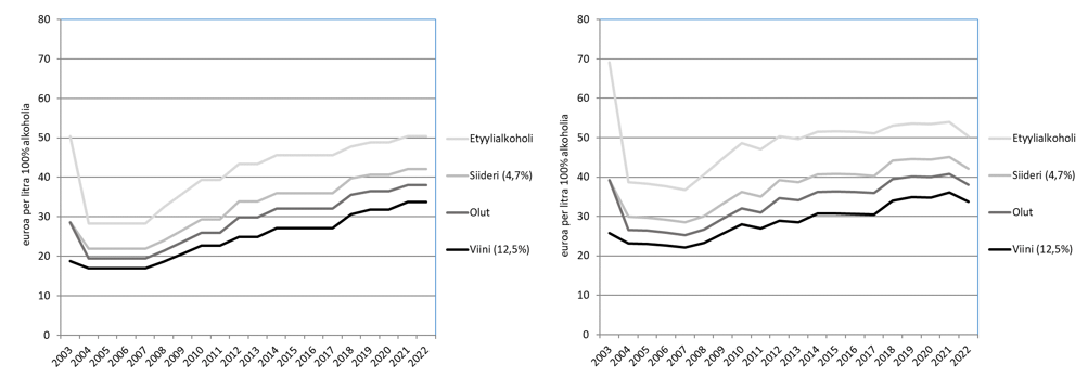 Kuvio 1 kuvaa sitä, miten alkoholiverotasot ovat muuttuneet nimellisesti ja reaalisesti vuoden 2022 tasossa. Kuvio osoittaa, että huolimatta lukuisista veronkiristyksistä vuodesta 2008 lähtien, alkoholiverotus ei ole kiristynyt merkittävästi, mikäli huomioidaan yleinen hintojen nousu. Alkoholivero on yksikkövero, joka vaatii säännöllisiä veronkorotuksia, jos halutaan välttää verotuksen reaalisen tason ja tästä johtuva vero-ohjauksen sekä verotuottojen aleneminen.
