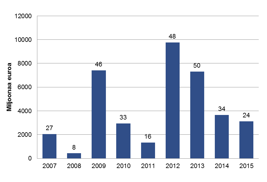 Lähde: Suomen joukkovelkakirjalainat 2011, Suomen joukkovelkakirjalainat 2015, Suomen Pankki. Pylväiden päällä olevat numerot kertovat antien kappalemäärän. Tietolähteiden muutoksen vuoksi tiedot vuodesta 2011 alkaen eivät ole täysin vertailukelpoisia aiempien vuosien kanssa. Luvut sisältävät sekä euromääräiset että muun valuutan määräiset joukkolainojen liikkeeseenlaskut.