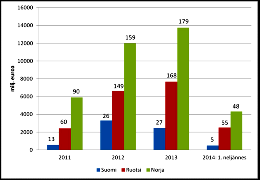 Euroopan keskuspankin (jäljempänä EKP) tilastoista havaitaan, että yritysten liikkeeseen laskemien joukkolainojen kokonaiseuromäärät ovat olleet Suomessa lähes samaa tasoa kuin muissa Pohjoismaissa. Sen sijaan Stamdata-tietokannan ISIN-tietojen mukaan yritysten liikkeeseen laskemien joukkolainojen liikkeeseenlaskumäärät ovat Suomessa olleet selvästi pienemmät kuin Ruotsissa tai Norjassa (kuva 2).