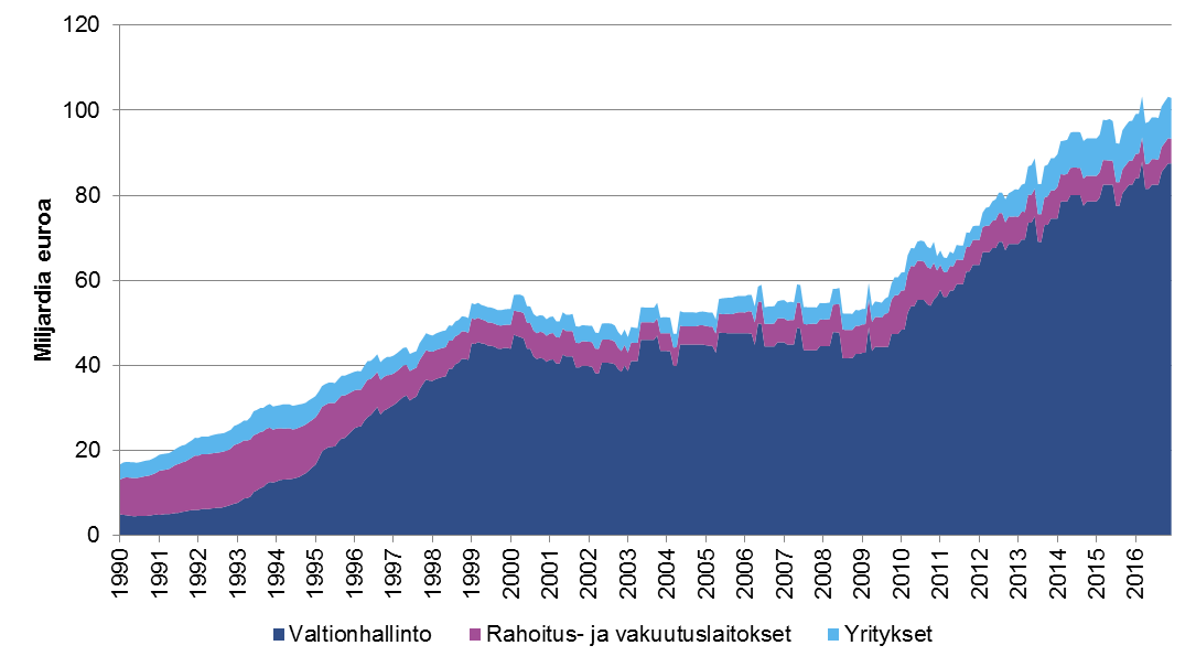 Kuva 4. Kasvua on tapahtunut myös kotimaassa liikkeeseen laskettujen joukkolainojen kohdalla (joukkolainojen nimellisarvoinen kanta vuosina 1990—2016)