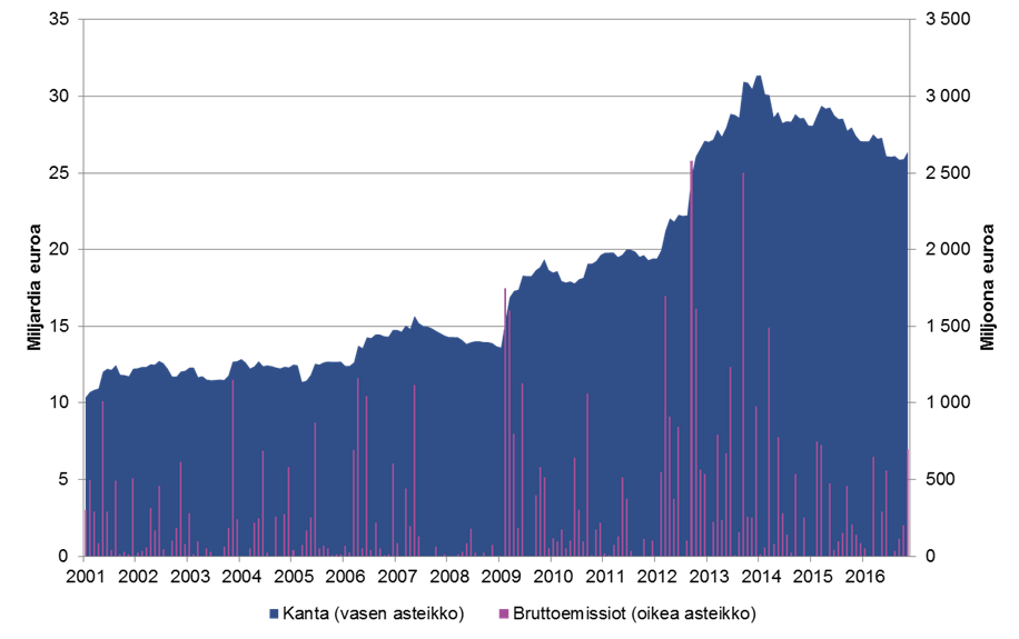 Kuva 5. Finanssikriisin jälkeen yritysten liikkeeseen laskemien joukkolainojen määrä on kasvanut vuosina 2001—11/2016