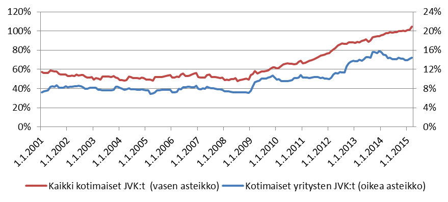 Vuoden 2015 alussa vajaat 70 suomalaista yritystä oli laskenut liikkeeseen joukkolainoja, kun vajaalla 80 kotimaisella yrityksellä oli viimeisten viiden vuoden sisällä ollut joukkolainoja liikkeessä. Yrityksistä vain suuret yritykset pystyvät käytännössä hankkimaan rahoitusta joukkolainoilla, koska likviditeetin säilyttämiseksi julkisen emission tulee olla suuri, mikä rajaa monet yritykset joukkolainarahoituksesta pois. Kotimaisten yritysten kaikkien, myös ulkomailla liikkeeseen laskettujen, joukkolainojen yhteenlaskettu arvo vaihteli viimeisten viiden vuoden aikana vajaasta 20 miljardista eurosta lähes 30 miljardiin euroon (kuva 5). Viimeisten viiden vuoden aikana joukkolainojen arvo on vaihdellut 17—32 miljardissa eurossa. Vuosina 2012 ja 2013 joukkolainojen käyttö yritysten rahoituksessa on kasvanut. Huipussaan yritysten joukkolainakanta oli tammikuussa 2014, minkä jälkeen joukkolainakanta on alentunut.