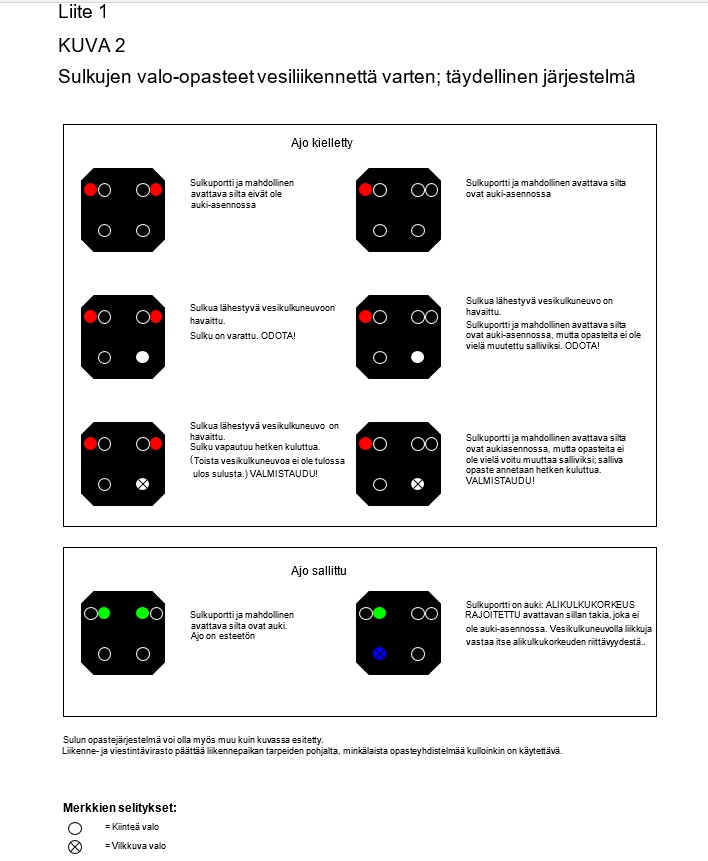 Vesiliikennelain 56 § sisältää vesiliikennemerkkien sijoittamista ja ulkoasua koskevat säännökset. Pykälän 4 momentin mukaan Liikenne- ja viestintävirastolla on oikeus antaa tarkempia määräyksiä vesiliikennemerkkien ja valo-opasteiden sijoituksesta, väreistä, rakenteesta ja mitoituksesta, mutta sillä ei ole toimivaltaa antaa määräyksiä käytettävistä valo-opasteyhdistelmistä. Nykyisin on käytössä monenlaisia valo-opasteyhdistelmiä. Tämä voi aiheuttaa valo-opasteiden väärin tulkintaa ja vaarantaa liikenneturvallisuutta.