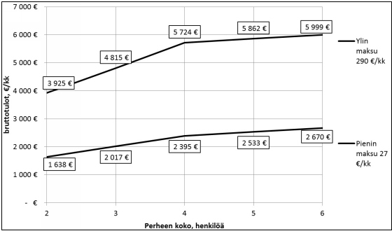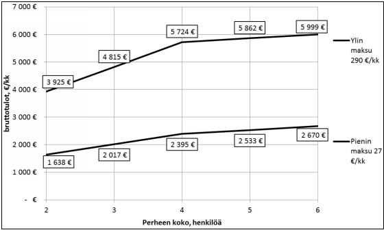 Jos perheen koko on suurempi kuin kuusi henkilöä, korotetaan maksun määräämisen perusteena olevaa tulorajaa 138 eurolla kustakin seuraavasta perheen alaikäisestä lapsesta.