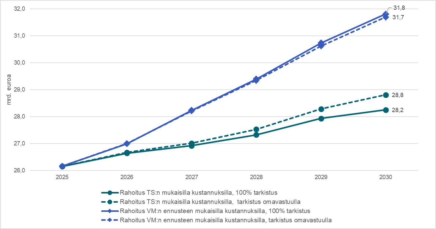Seuraavassa kuviossa 1 kuvataan hyvinvointialueiden koko maan rahoituksen tasoa ja omavastuun lisäämisen vaikutuksia edellä sekä tarkemmin esityksen luvussa 4.2.1.2. kuvattavilla alueiden taloussuunnitelmien ja valtiovarainministeriön ennusteen mukaisilla kustannuskehityksillä.