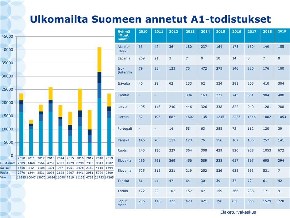 Täysin luotettavaa ja tarkkaa tietoa Suomeen lähetetyistä työntekijöistä ei ole saatavilla. Suomeen lähetetyistä työntekijöistä on tilastotietoja saatavissa ainoastaan EU:n jäsenmaiden sosiaaliturvaviranomaisten Suomeen annettujen A 1 -todistusten perusteella. Eläketurvakeskus vastaanottaa saamansa tiedot EU:n jäsenmaista Suomeen lähetetyistä työntekijöistä. Saatujen todistusten perusteella alla ovat tilastot maittain vuosilta 20102019. Tilastojen mukaan lähetettyjä työntekijöitä koskevia A1-todistuksia myönnetään eninten Virosta, Puolasta, Saksasta ja Liettuasta. Tilastoista ei ilmene lähetetyn työntekijän kansalaisuutta, vaan maa, jonka kautta työntekijä on lähetetty Suomeen. Lisäksi sama työntekijä voi olla tilastoituna useamman kerran.