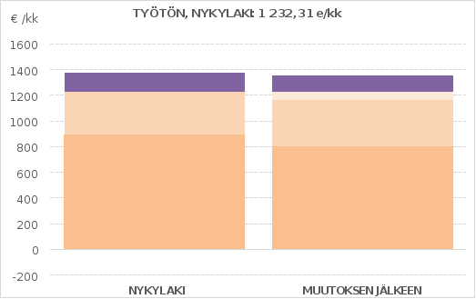 yksin asuva työtön henkilö, pääasiallisena tulona työmarkkinatuki, asuu Joensuussa (3. kuntaryhmä), vuokra ja vesilasku 612 euroa kuukaudessa