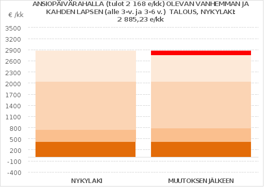 yhden vanhemman perhe ja kaksi lasta (alle 3 vuotias ja 3–6 vuotias), pääasiallisena tulona ansiopäiväraha, perhe asuu Vantaalla (2. kuntaryhmä), vuokra ja vesilasku 1 145 euroa kuukaudessa Nykytilanteessa lapsilisän yksinhuoltajakorotuksen määrä on huomioitu pysyvän lainsäädännön mukaisena (ei väliaikaisen, 31.12.2023 saakka voimassa olevan korotetun määrän mukaisena).
