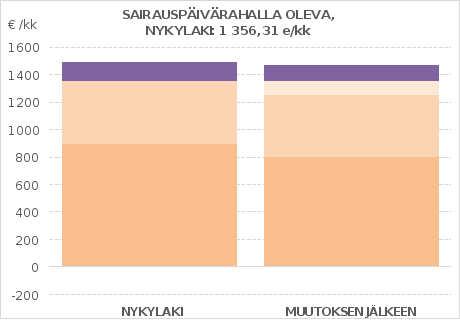 yksin asuva sairauspäivärahaa saava henkilö, pääasiallisena tulona vähimmäismääräinen sairauspäiväraha, asuu Vantaalla (2. kuntaryhmä), vuokra ja vesilasku 736 euroa kuukaudessa