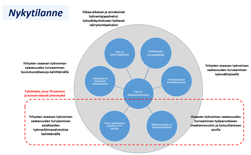 Hallitusohjelman mukaan kuntien roolia työllisyyspalveluiden järjestäjänä vahvistetaan. Työllisyyspalveluiden järjestäminen ja toteuttaminen voidaan sopimuksella antaa yhden tai useamman kunnan tehtäväksi kuntien kanssa tehtyjen sopimusten pohjalta. Toimeenpanon tueksi säädetään tarvittaessa erillislainsäädäntö.