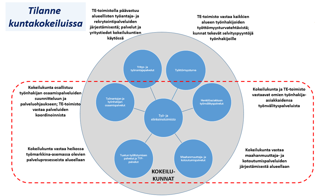 Kokeilualueilla olisi kaikki kuntalain mukaiset keinot yhteistyönsä järjestämiseksi. Työllisyyden edistämisen kuntapohjaisen järjestämisen vaikuttavuuden odotetaan syntyvän pitkälti niistä eduista, joita kunnilla on monitoimialaisina ja asiakkaansa hyvin tuntevina toimijoina. Kokeilualueilla on mahdollisuus luoda valtiolta siirtyvistä palveluista, kuntien yleisen toimialan työllisyys- ja yrityspalveluista ja muista palveluista tehokkaita työllisyyden edistämisen palvelukokonaisuuksia.