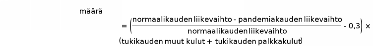 Tuki-intensiteetti lasketaan seuraavasti: [(yrityksen liikevaihto 1 päivän maaliskuuta ja 31 päivän toukokuuta 2019, nämä päivät mukaan lukien – yrityksen liikevaihto 1 päivänä maaliskuuta ja 31 päivänä toukokuuta 2021, nämä päivät mukaan lukien) : yrityksen liikevaihto 1 päivänä maaliskuuta ja 31 päivänä toukokuuta 2019, nämä päivät mukaan lukien] – 0,3. Tukien intensiteetin enimmäismäärä on 70 prosenttia, tuen määrä enintään 1 000 000 euroa. Tuesta vähennetään tukikaudelle kohdistuvat vakuutuskorvaukset ja muut samoihin kustannuksiin saadut valtiontuet. Tukea myönnettäessä otetaan huomioon, ettei Euroopan komission päätöksen SA.XXX mukainen tukien konsernikohtainen enimmäismäärä, 10 miljoonaa euroa, ylity.