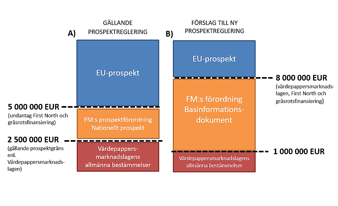 Syftet med propositionen är att genom att se över bestämmelserna om prospekt som ska offentliggöras över värdepapper förbättra möjligheterna att få företagsfinansiering på marknadsmässiga villkor och underlätta medelsanskaffningen för små emittenter på kapitalmarknaden. Propositionens syften stöder för sin del de mål som ställts upp för en kapitalmarknadsunion. Syftet med propositionen är att lätta upp den gällande prospektregleringen genom att minska den administrativa bördan i synnerhet för små och medelstora företag, samtidigt som ett tillräckligt investerarskydd och marknadseffektivitet garanteras. Genom den nya regleringen om prospekt förbättras marknadens funktion särskilt i samband med mindre värdepapperserbjudanden och i situationer där emittenten är ett redan börsnoterat företag som skaffar tilläggskapital. Propositionen anses ha positiva effekter i form av sänkta kapitalkostnader som i sin tur förbättrar tillgången på kapital på Finlands ekonomiområde.
