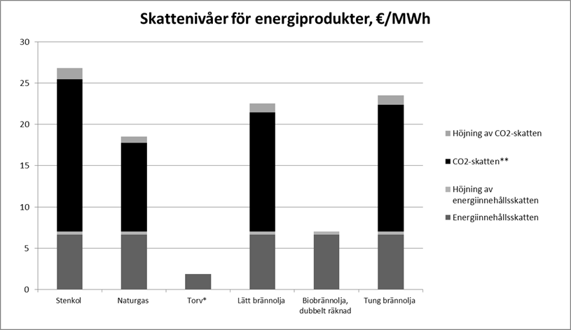 Höjningen av koldioxidskatten på uppvärmningsbränslen från nuvarande 54 euro till 58 euro per ton innebär att exempelvis koldioxidskatten på lätt brännolja stiger från cirka 0,0040 euro per megajoule till cirka 0,0043 euro per megajoule. Syftet med en höjning av koldioxidskatten är att uppmuntra till användning av uppvärmningsbränslen med låga utsläpp och främja naturgasens konkurrensställning, i synnerhet i förhållande till stenkol. Höjningen av energiinnehållsskatten med 0,4 euro per megawattimme innebär att energiinnehållsskatten stiger från 0,00185 euro per megajoule till 0,00196 euro per megajoule.