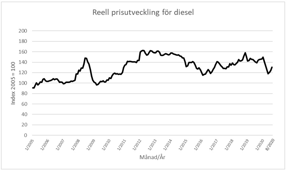 Figur 2. Den reella prisutvecklingen för diesel. Källa: Statistikcentralen