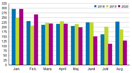 Statistikcentralen. Anhängiggjorda konkurser januari–augusti 2018–2020