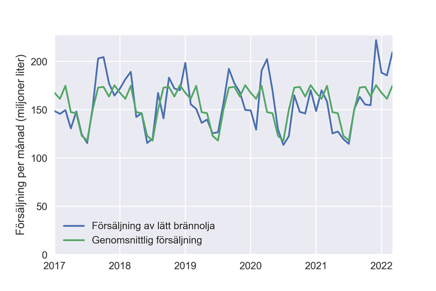 Från 2017 till och med mars 2022 har det sålts i genomsnitt 157 miljoner liter lätt brännolja per månad. Försäljningen varierar enligt årstid och enligt år (figur 2). Under vintermånaderna säljs det cirka 20 procent mer brännolja än under sommaren. Under stödperioden februari–april säljs i genomsnitt en fjärdedel av årsförsäljningen av brännolja.