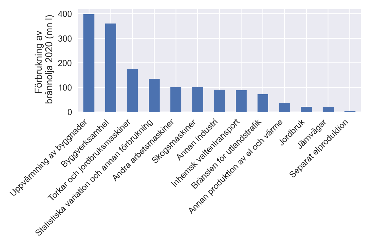Under vintermånaderna varierar försäljningen av brännolja betydligt mer runt genomsnittet än under sommarmånaderna. Detta är antagligen en följd av att den större försäljningen av uppvärmningsolja under vintermånaderna beror på byggnaders uppvärmningsbehov, vilket i sin tur varierar enligt temperatur. Uppgifter om hur försäljningen av brännolja fördelar sig enligt användningsändamål finns tillgängliga på årsnivå (figur 3). Det viktigaste enskilda användningsändamålet är uppvärmning av byggnader. En del av byggnaders uppvärmningsanvändning ingår i punkterna annan industri och jordbruk. Den förbrukning av brännolja som omfattas av brännoljestödet ingår i punkterna byggnadsverksamhet, andra arbetsmaskiner och skogsmaskiner. Uppgifter om den mängd brännolja som dessa arbetsmaskiner förbrukar finns inte direkt tillgängliga för stödperioden, men den förbrukade mängden är uppenbarligen lägre än genomsnittet för hela året, eftersom försäljningen av brännolja under stödperioden motsvarar mängden enligt genomsnittet för året, men användningen för uppvärmning under den tiden av året är större.