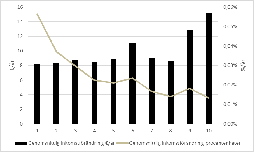 I förhållande till inkomsterna minskar en sänkning av mervärdesskatten på elenergi mest skattebördan för låginkomsttagare, men räknat i absoluta eurobelopp drar de som har stora inkomster större nytta av sänkningen. I kalkylen antas det att hushållens avtalspriser fördelar sig jämnt på de olika inkomstklasserna.